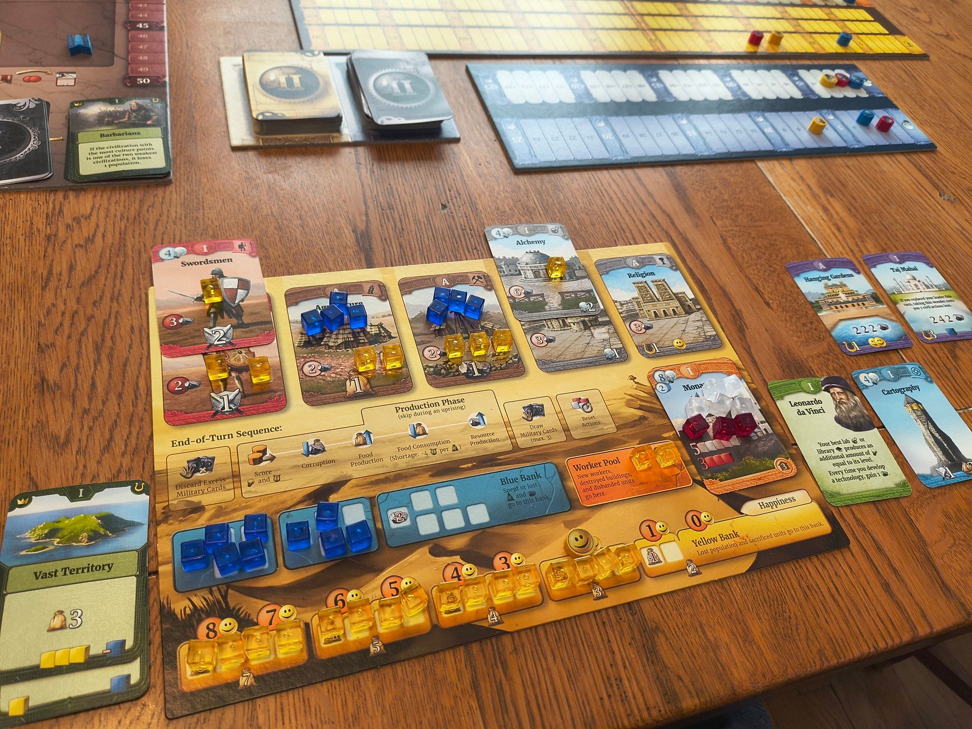 [Ryan] Look what I managed to get to the table! A 3-player game of Through the Ages: A New Story of Civilization. Daniel and I have a long history with this game, playing the old edition ~10 times back around 2011, but ultimately culling it as our collection grew, and feeling it could be a little brutal for how long it was. But the new edition really cleaned some things up, and both of us have now happily reacquired it! I was teaching two new players, and it was a great experience and a reminder of how engaging this game manages to be for its entire 4+ hour length. I don’t get it to the table often, but I won’t lie, I’m really interested in picking up the expansion for some more card variety!