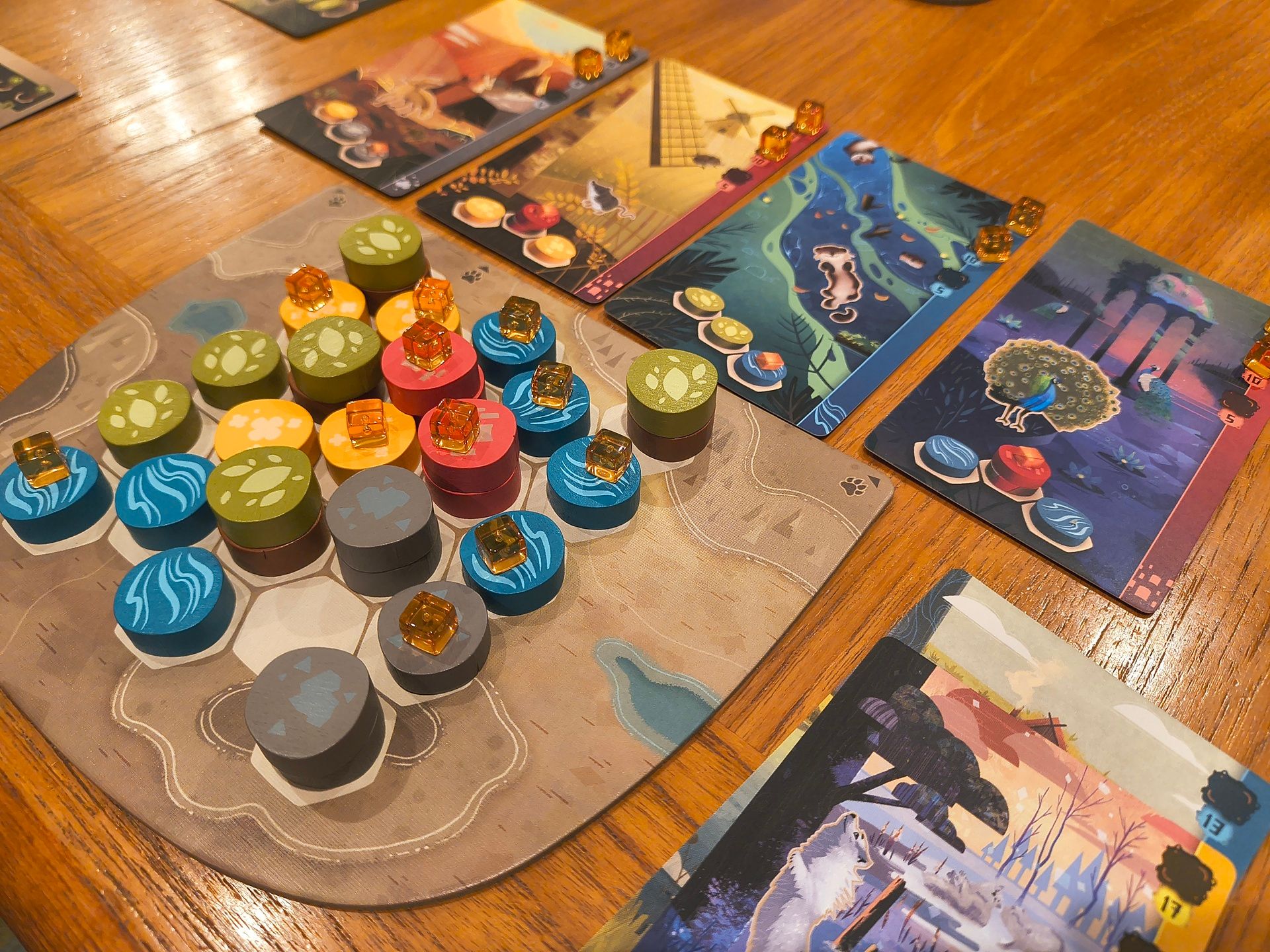 [Ryan] Oh man, I had been kind of sleeping on trying Harmonies since it sounded like yet another pattern-building game, a genre that is becoming crowded and that was already filled by Cascadia in my collection. But I kept hearing so many good things that I had to give it a try, and I was kind of blown away by how much I like this one. It is actually quicker than other comparable games, and yet I feel like it delivers an even more satisfying puzzle. The combination of the base landscape scoring and the animal scoring is a nice dual-layer puzzle, but it is really the way you can optimize each animal pattern to trigger them multiple times that makes this game sing. Really loving it so far!